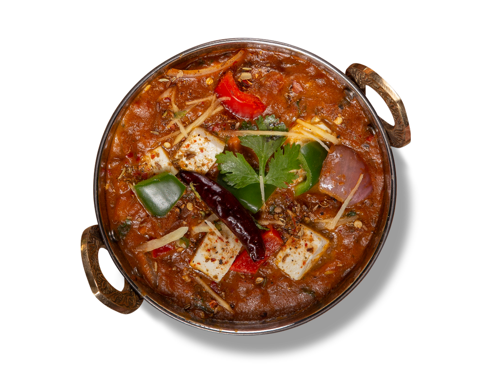 Cottage cheese braised in kadhai with freshly pounded spices with onion, capsicum.